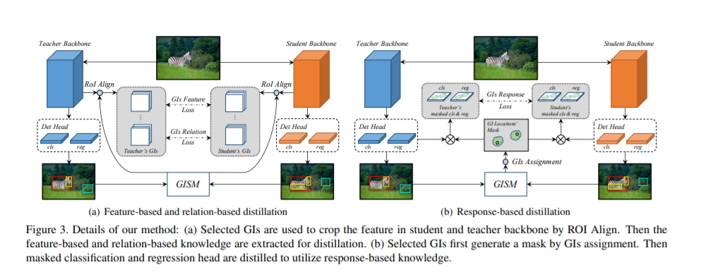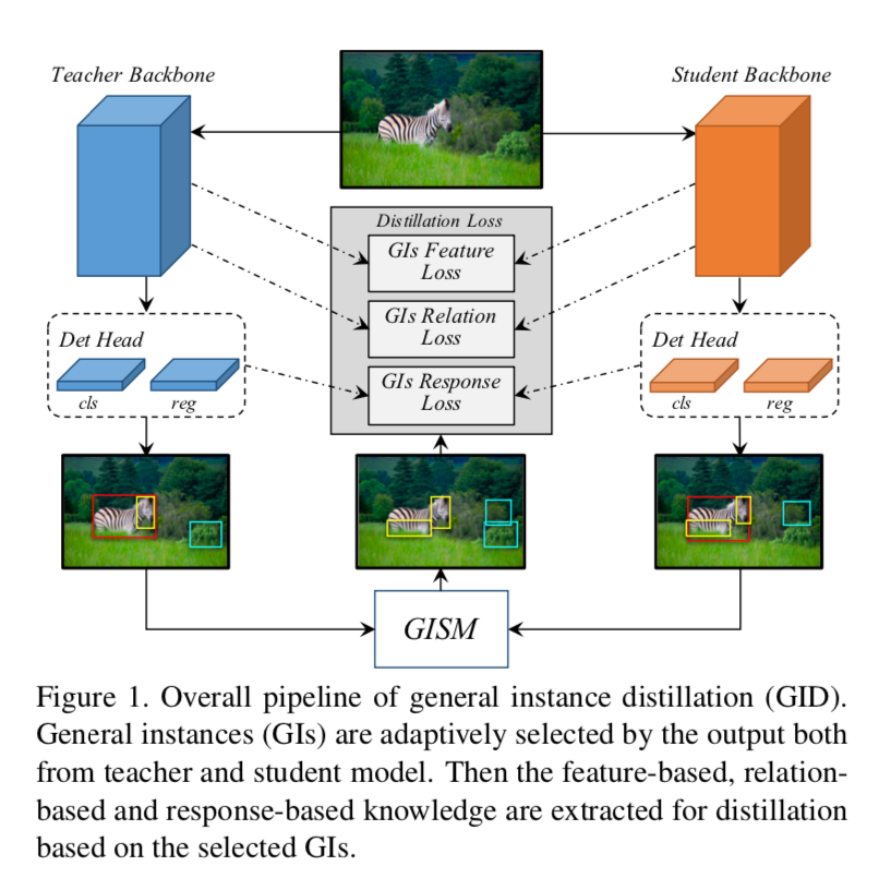 GID提出了一种基于检测任务的新型蒸馏方法。通过从teacher和studnet中分别提取general instance (GI),并提出GISM模块自适应选择差异大的instance进行feature-based、relation-based以及response-based蒸馏。本方法首次将关系型知识蒸馏应用于检测框架,且将蒸馏目标从独立考虑的正负样本蒸馏统一为更本质GI蒸馏,过程中不依赖于GT,且达到SOTA。