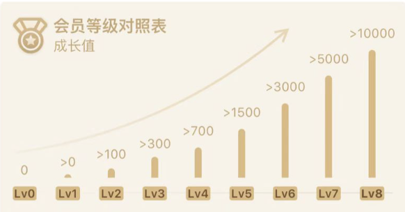 目前孩子王的成长型会员共分为8个等级:L1-L8,各等级的成长值要求如下: