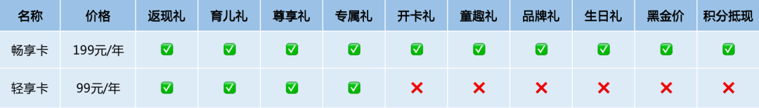 199元/年的畅享卡则瞄准的是婴幼童人群,在轻享卡的基础上,增加了6项权益,主要以消费需求为主,突出两个特点: