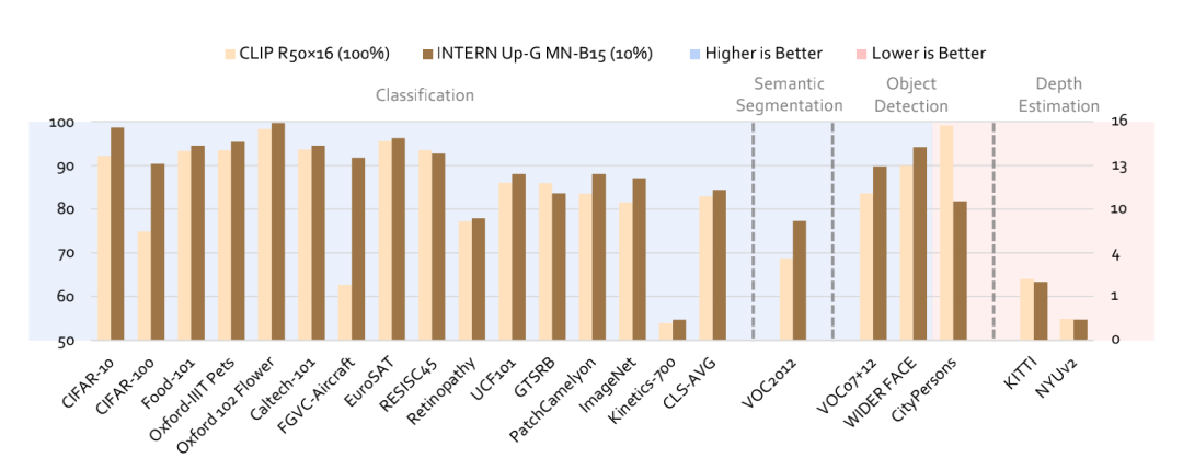 不仅包括常规分类任务还包括细粒度分类任务,还包括医疗图像等特殊领域的分类任务、行人检测等热门检测任务,扩展到分割与深度任务,可以很好地衡量模型的泛化能力。