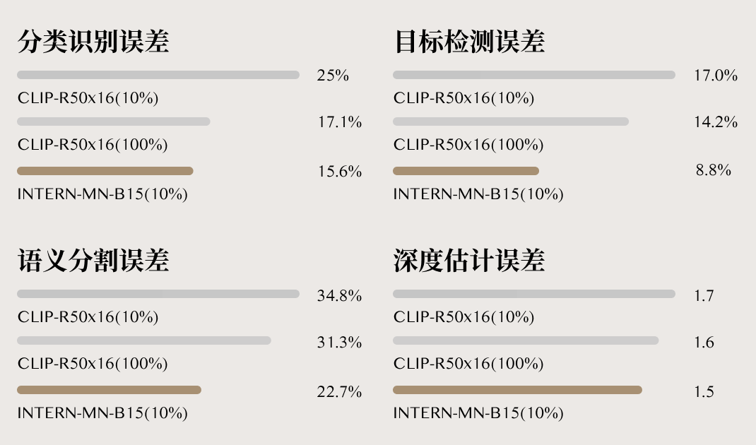具体来讲,在分类识别、目标检测、语义分割及深度估计四大任务26个数据集上,「书生」的平均错误率分别降低了40.2%、47.3%、34.8%和9.4%。