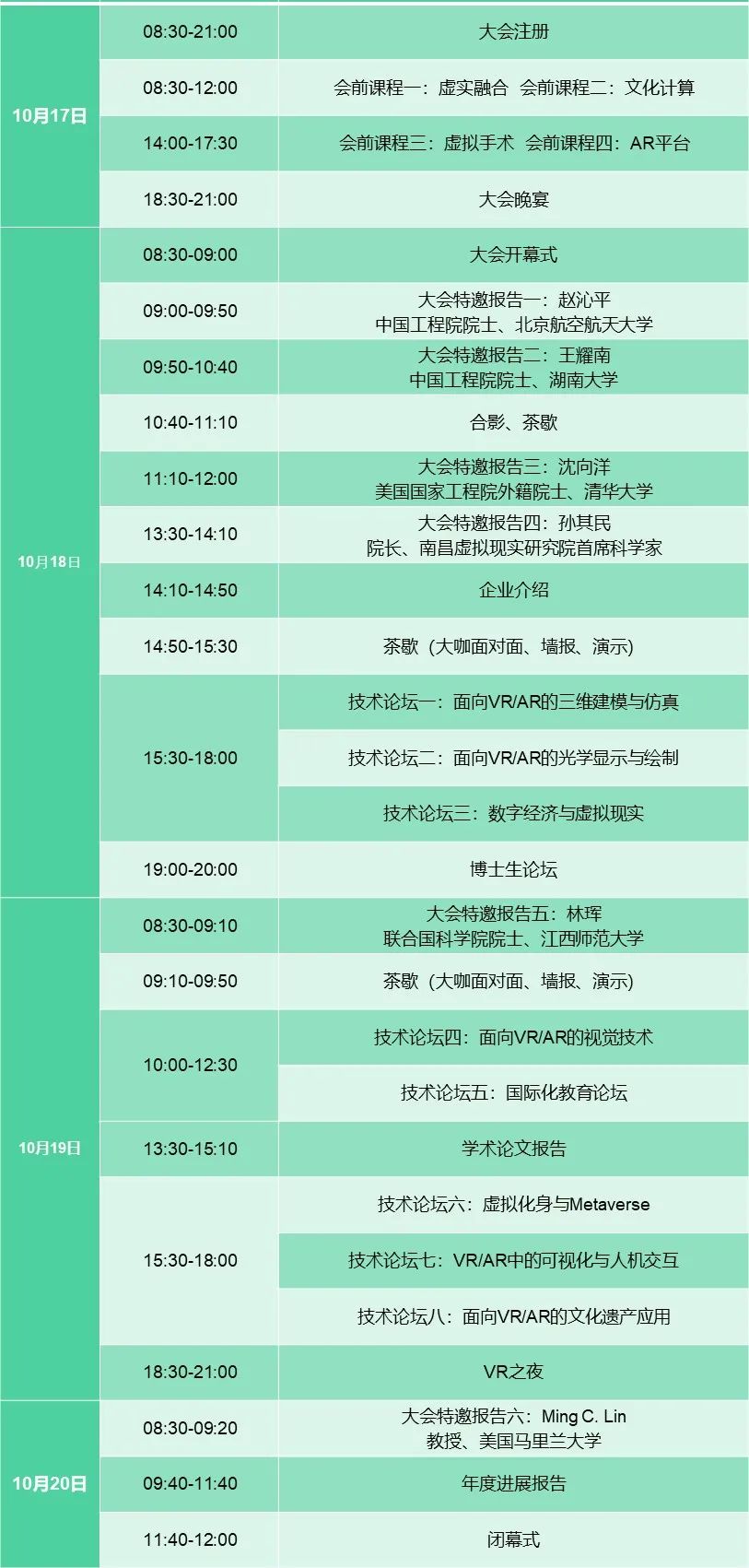 会议邀请了院士、ACM/IEEE Fellow、长江学者、国家杰青获得者、知名教授、工业界学者等为参会者带来5个高水准特邀报告、4场会前课程、4场学术论文交流报告、8场主题论坛、年度进展报告、大咖面对面、VR之夜和博士生论坛。会议期间将同时举办2021年中国虚拟现实大赛。欢迎从事虚拟现实以及相关领域的研究人员、技术专家及产业界人士踊跃参会!