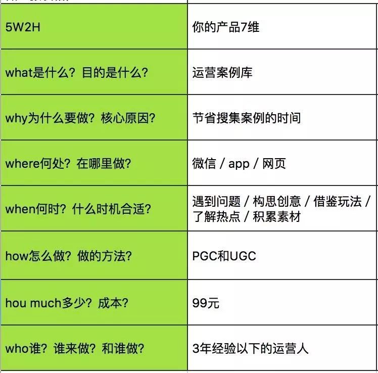 比较好用的5H2W模型,去做不同用户的分析,每一类用户都可以做一份分析表格: