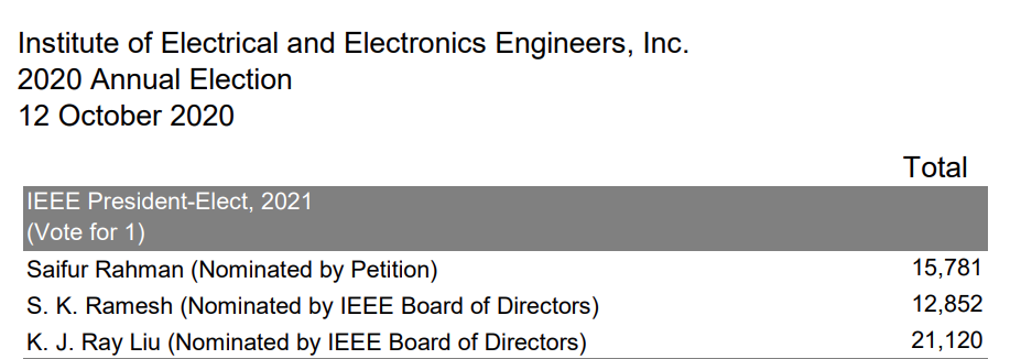 官方公告中提到,刘国瑞以 21120 票赢得本次主席选举,并将于 2022 年 1 月 1 日开始担任 IEEE 主席,他将接替在 2021 年结束任期的 Susan K. “Kathy” Land。此外,IEEE 主席的另外两位候选人是 Saifur Rahman(15781 票)和 S. K. Ramesh(12852 票)。
