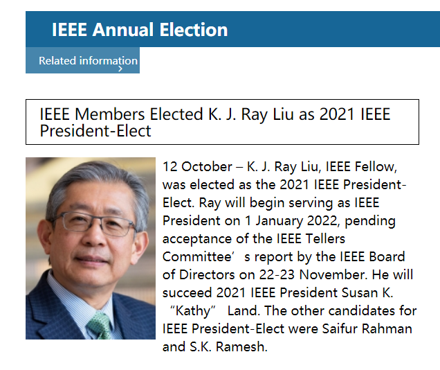 刘国瑞以 21120 票当选为 IEEE 历史上首位华人主席,将于 2022 年 1 月 1 日开始任职。