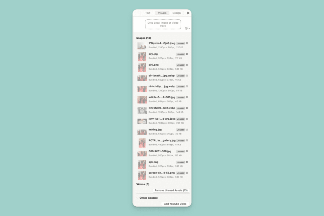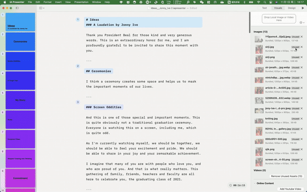 这个界面是幻灯片中的素材库。iA Presenter 支持通过拖拽的方式插入本地图片、视频,这些素材会显示在此处的列表中。你也可以预先将可能用到的文件先拖到库中,待写完文稿后再统一插入。(如果你用过 iA Writer,那么一定不会对这个操作逻辑感到陌生。)