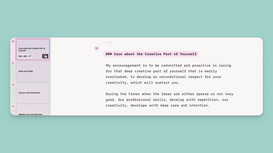 中间是主工作区,用来撰写要讲述的故事。在这里,可以用熟悉的 Markdown 格式把幻灯片「写」出来。但主要的特殊之处在于: