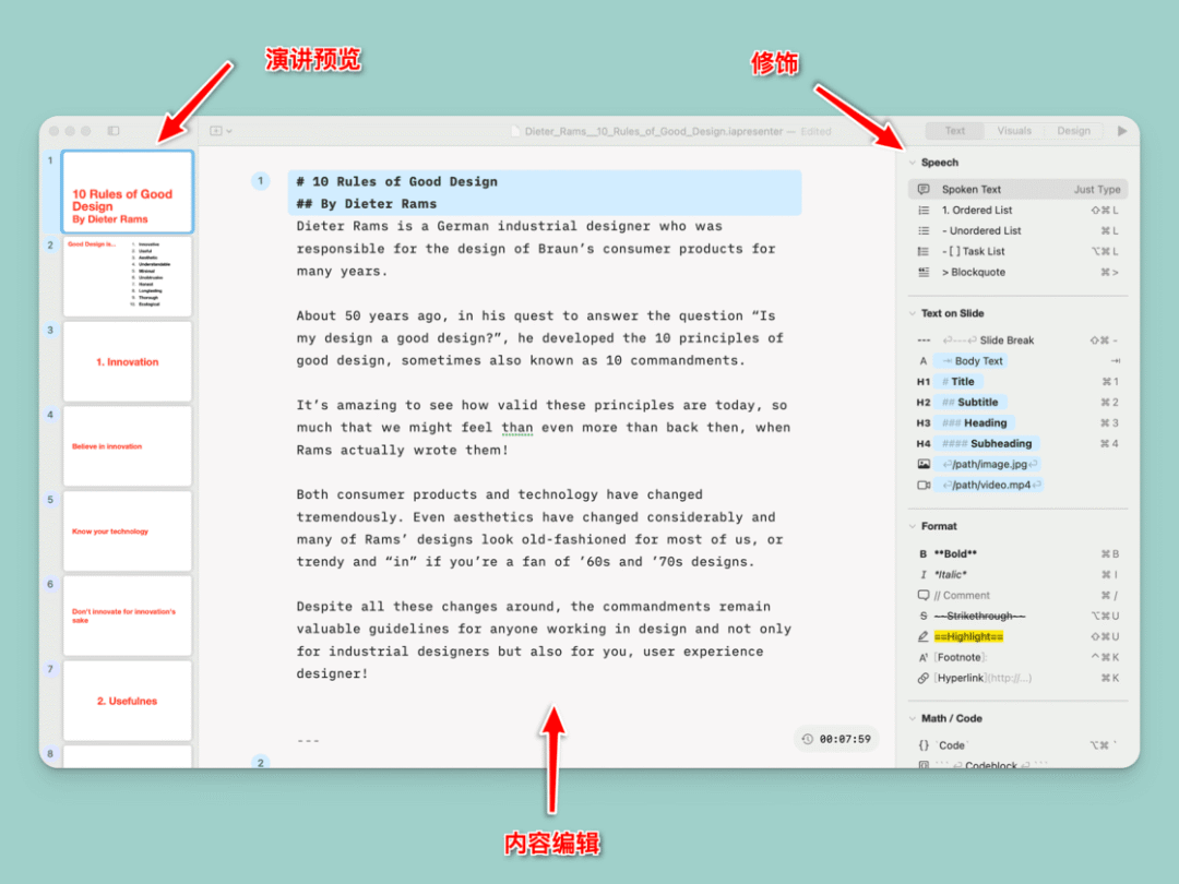 在演讲功能上,iA Presenter 也有着自己的想法。