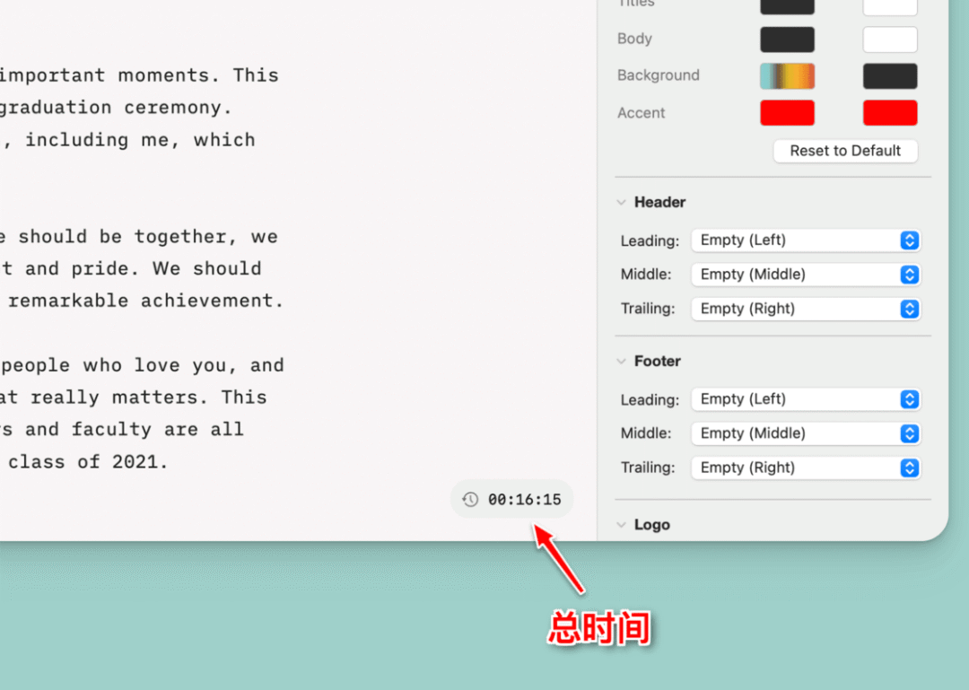 首先,在内容编辑页面的右下角,也就是很多写作软件用来显示字数统计的位置,有一个时间标识,根据字数大致估算了演讲时间。