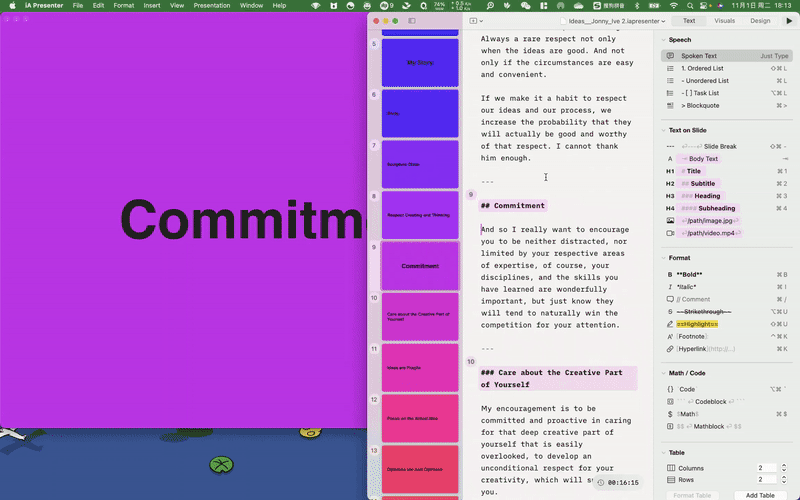 这个界面结合了格式选项和语法提示的功能,每一行既是功能按钮,又是一条列明了对应 Markdown 语法的「小抄」。令我感到惊喜的是,iA Presenter 的格式支持相当齐全,包括文本高亮、数学公式、表格等。