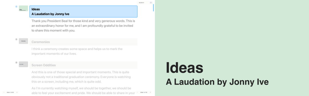 点击右上角的放映按键,就进入了演示模式。iA Presenter 此时会一分为二:一个窗口是对外演示给观众的幻灯片,另一个窗口是给自己看的稿件页面。