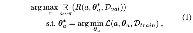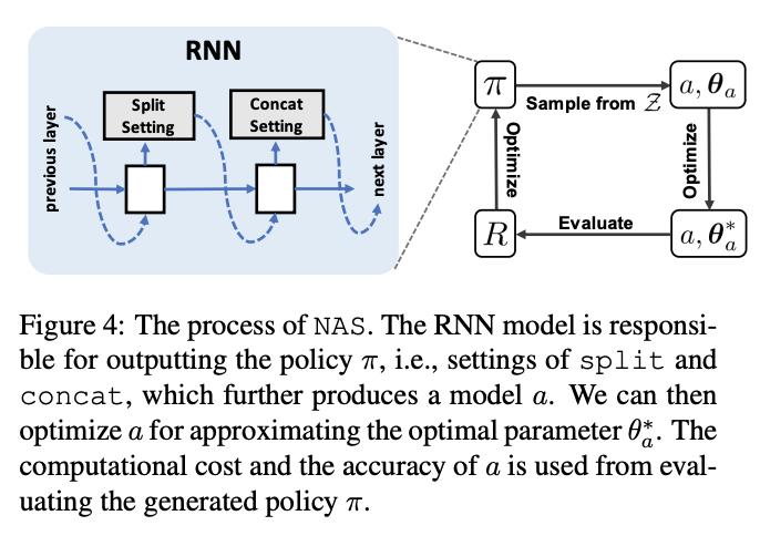 在生成搜索空间后,下一个步骤就是找到最优的动态网络结构,搜索过程将网络 表示为两种转换的设置,并标记 为包含不同设置的空间。论文采用NAS常用的policy gradient based强化学习方法进行搜索,该方法的目标是优化策略 ,进而通过策略 得到最优的网络结构,优化过程可公式化为嵌套的优化问题: