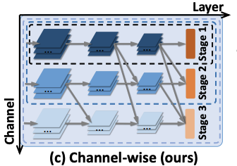 为了解决上述问题且不需要重新设计网络结构,论文提议将目标网络转换成channel-wise多阶段网络,如图c所示。该方法保持目标网络的结构,在channel层面将目标网络分成多个阶段,仅在最后的卷积层添加预测器。为了降低计算量,每个阶段的channel数都相对减少。基于图c的思想,论文提出通用结构S2DNAS,能够自动地将目标网络转换成图c架构的动态网络。