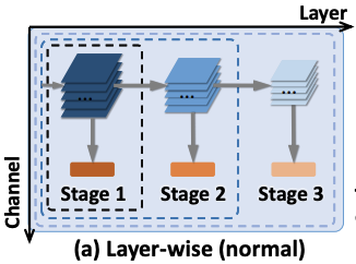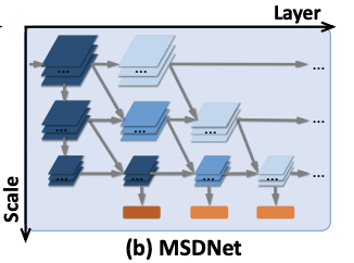 为了解决上述问题,MSDNet设计了二维(Layer-Scale)多阶段架构来获取各层的粗粒度特征和细粒度特征,如图b所示,每个预测层都能利用深层的语义特征,可达到较好的准确率。然而,MSDNet是精心设计的专用网络结构,若需要转换其它目标网络,则需要重新设计类似的范式。