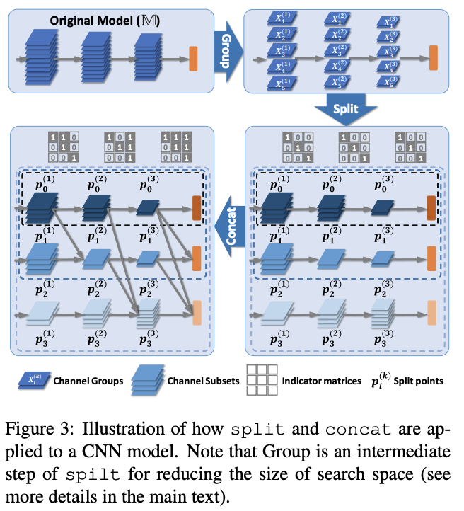 给定目标网络 ,S2D生成包含由 转换的多个网络的搜索空间 ,如图3所示,转换过程包含split操作和concat操作:
