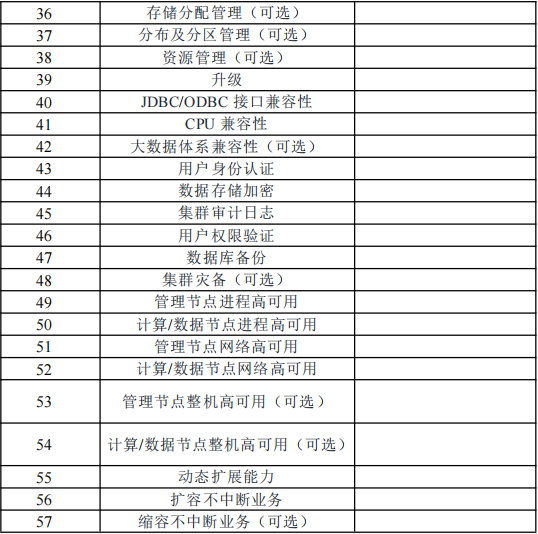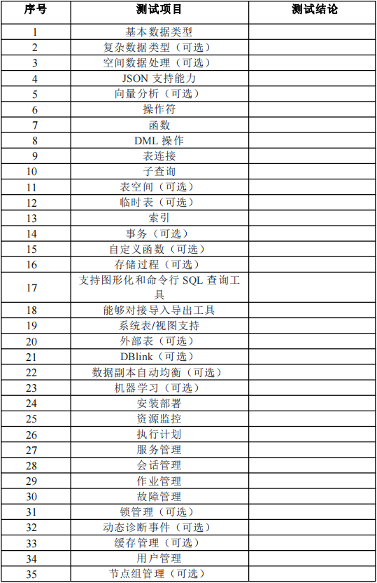 而每种类型数据库的测试包括功能、性能、安全性、稳定性四大项,涉及大概 20 - 30 个必选测试用例,以及 10 个左右的可选测试用例,整体设计参考了我国工信部发布的各类数据技术要求与测试方法标准文件。以分析型数据为例,其测试标准表如下:
