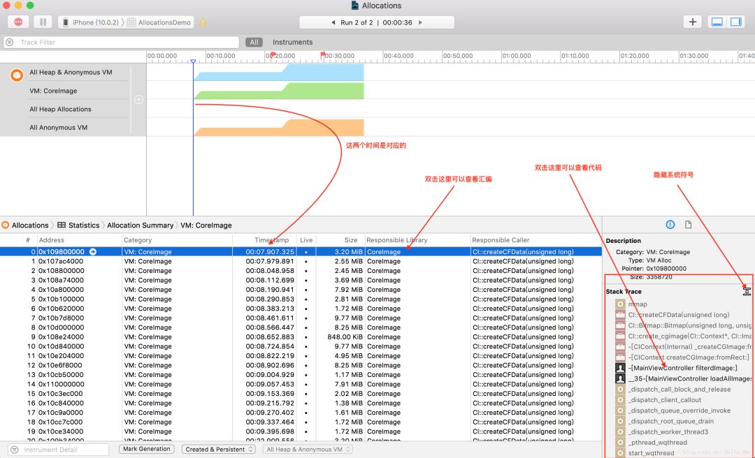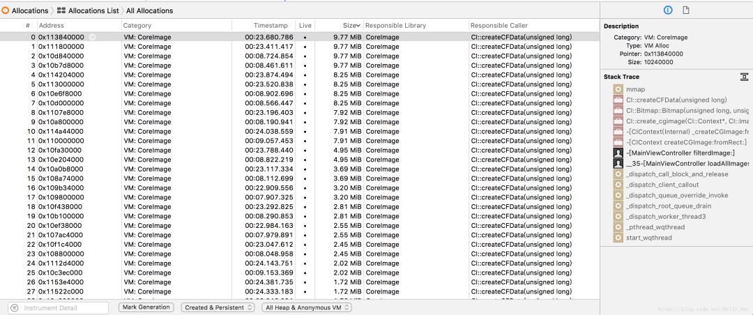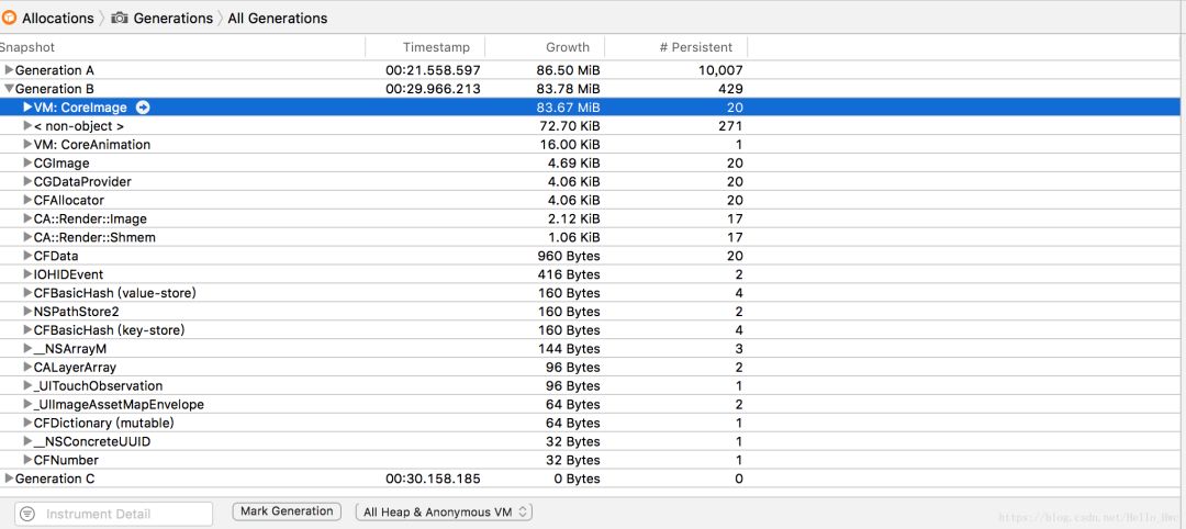 点Statictis,从下拉列表中,选择Generations,我们就可以看到内存增量主要在VM: CoreImage中,这里的每一行也可以点击查看详情,或者在右侧查看栈: