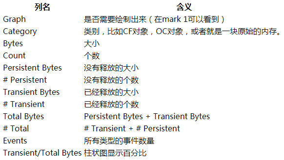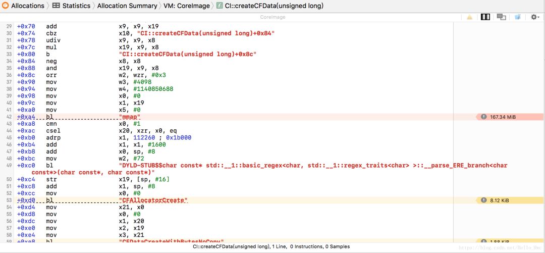 All Anonymous VM 匿名的虚拟内存区域。何为匿名呢?就是Allocations不知道是你哪些代码创建的内存,也就是说这里的内存你无法直接控制。像memory mapped file,CALayer back store等都会出现在这里。这里的内存有些是你需要优化的,有些不是。