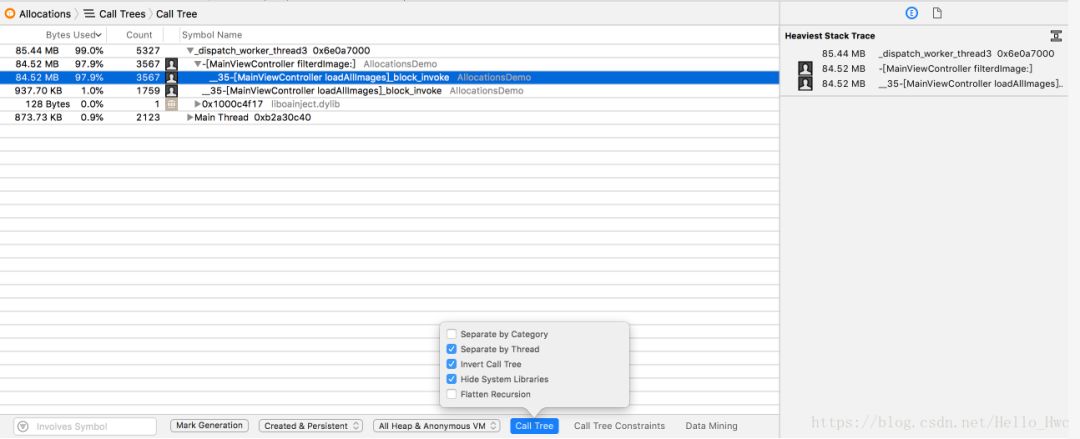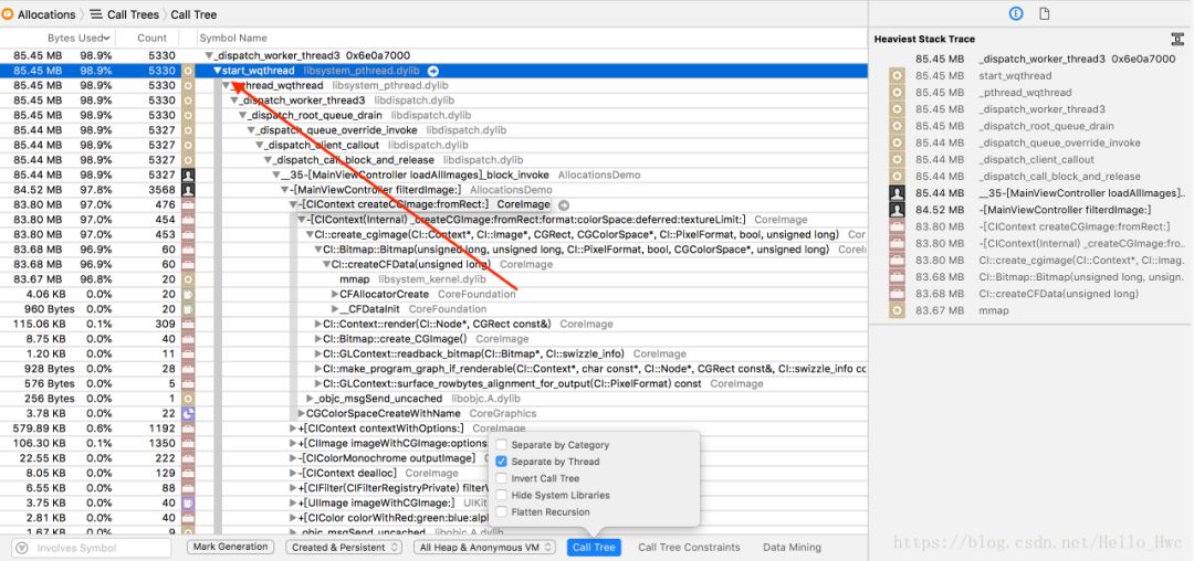 按照类似的方式,这次我们选择Call Tree来直接分析代码是如何创建内存的,勾选Separator By Thread,按照线程来对内存进行分类: