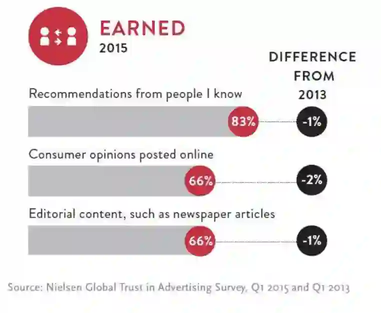 Nielsen2015年的全球广告信任度调查报告显示,83%的消费者信任朋友和家人的推荐,这是典型的口碑营销的作用。