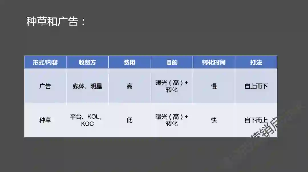虽然种草和广告的本质相同,但二者在投放费用、内容指向销售的转化时间和营销的打法上还是有所区别的。