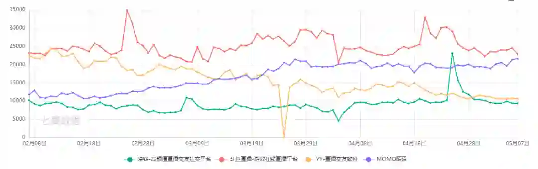 下载量上,七麦数据显示,过去90天,映客每天的下载量维持在1万左右,低于其他几大主要的直播平台。