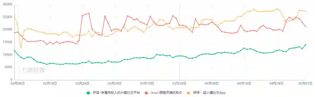 积目、Soul、探探近90天App Store下载量对比,来源:七麦数据