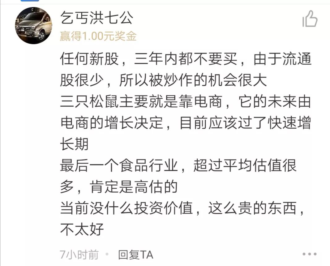 今年7月刚上市三只松鼠,在上市后已经暴涨了近三倍,如今市值超过270亿元,预告这样的表现显然是不足以支撑当前公司估值的。对于三只松鼠这样的次新股,球球的想法和雪球球友@乞丐洪七公的看法一直: