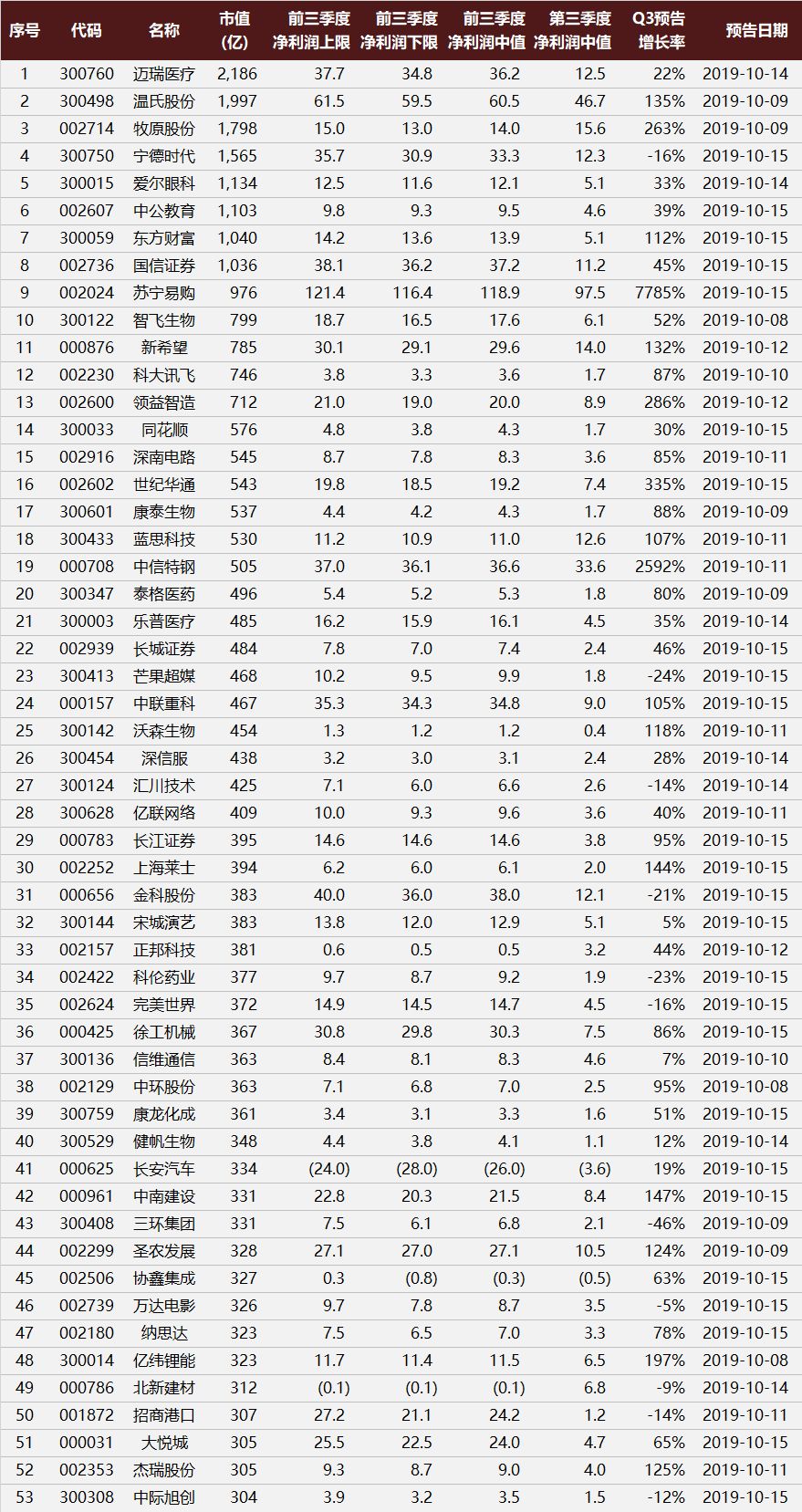 这些发布了预告的业绩怎么样呢?球球列举了市值300亿以上,在10月发布业绩预告的数据,共有53家公司: