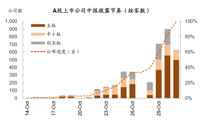 除此以外,还有30家上市公司已经正式披露三季度财报,根据财报预约时间,10月底将迎来业绩披露的高峰期。