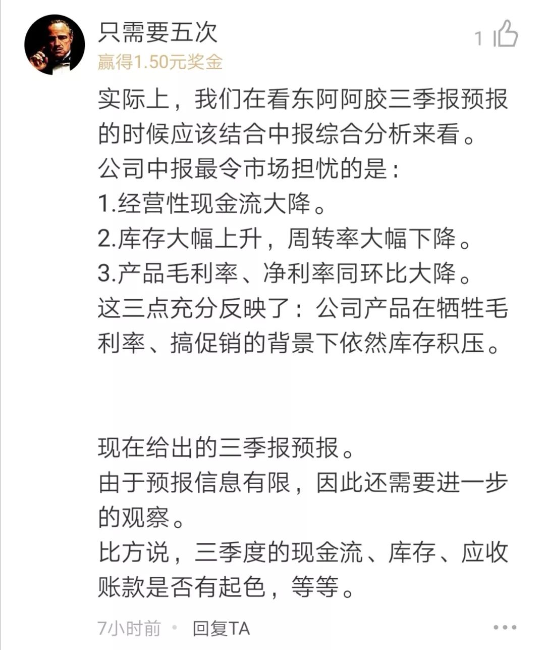东阿阿胶在公布了一份“历史最差”的半年报后,这一份预告数据并不算好,虽然今天股价涨了。球球比较认可雪球球友@只需要五次的解读,现在东阿阿胶三季度的预告信息不足,难以判断到底是否真的走出困境了,其他如现金流,库存等核心指标需要在三季报正式发布的时候好好看看。