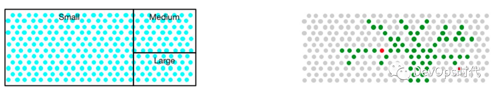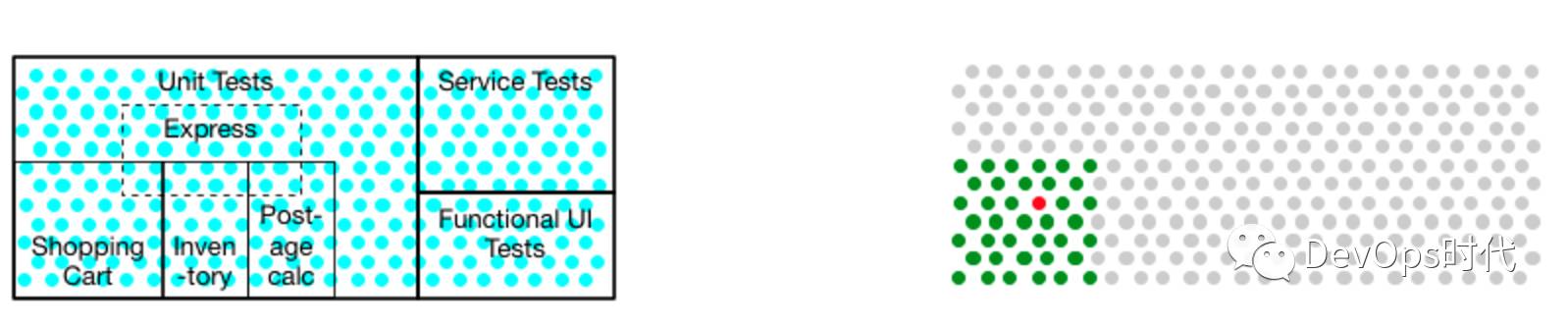 左图:对单元、服务和功能 UI 进行分组。在单元测试中,对有意义的子组进行标记,包括一个 "express", 它对其他的子集进行抽样。