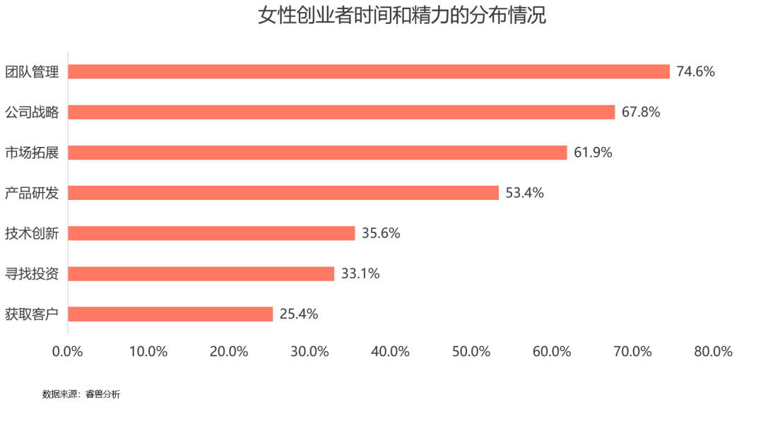女性在创业和经营公司过程中会在团队组织管理和战略规划方面花费比较多的时间精力,期待获得对行业利好的政策支持与合适的资金支持;