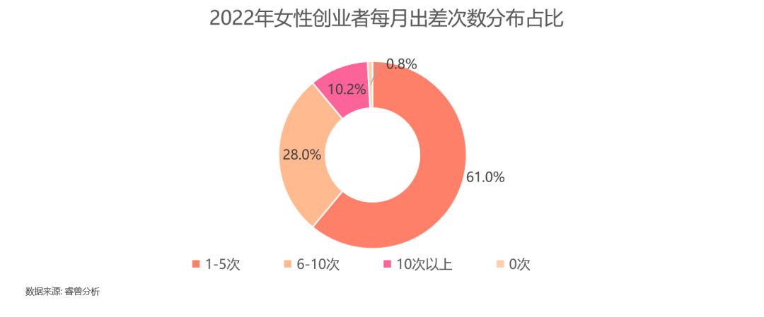 创业就意味着要时刻保持着战斗的状态,以牺牲自己休息娱乐的时光为代价,61%的女性创业者每月出差次数是1-5次;有28%的女性创业者每月出差次数更是高达6-10次;