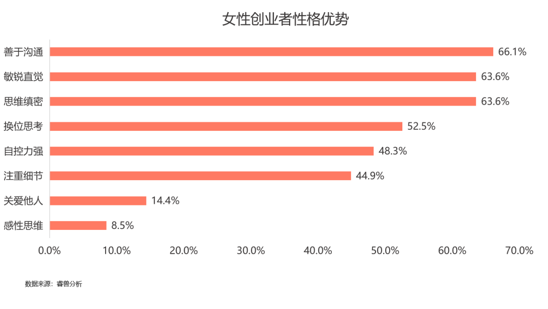 性格优势方面:善于沟通、思维缜密、具有同理心能够换位思考等性格特点在女性创业过程中发挥了重要的作用;