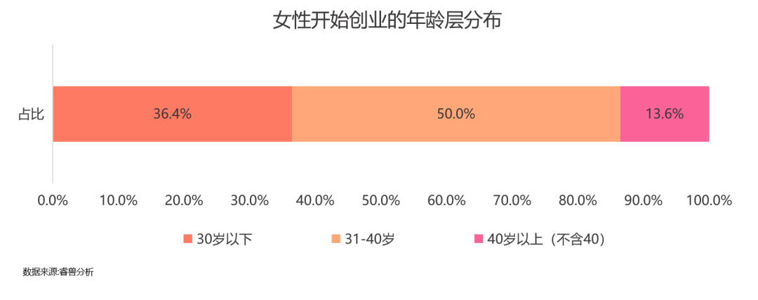 女性创业年龄趋于年轻化,36.4%女性是在30岁之前就开始创业,50%的女性在31至40岁开始创业;