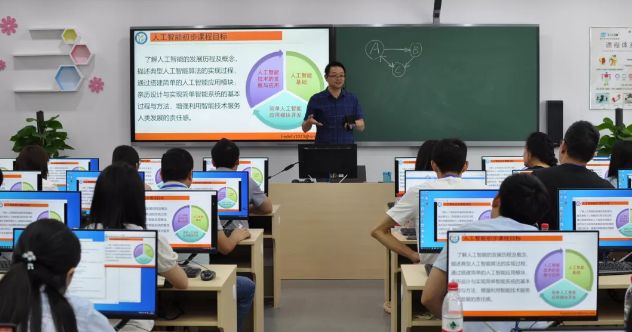 2019年9月22日,实践教学在湖北省武昌水果湖第一小学进行,中国人民大学附属中学高级教师武迪,湖北第二师范学院计算机学院教授贺德富和中国人民大学附属中学信息技术教师徐乾分享了他们开展的人工智能课程教学实践案例。
