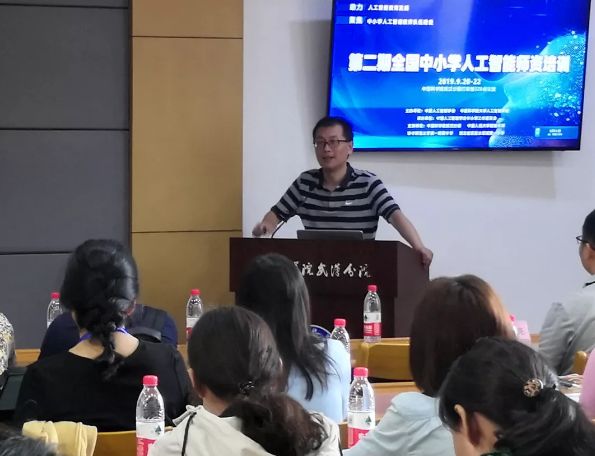 中国人民大学附属中学信息技术教研组长、中国人工智能学会中小学工作委员会秘书长袁中果做”中学人工智能课程设置与实践基础 “主题讲座