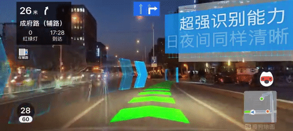 在2019年12月27日全网发布的搜狗地图App 10.6版本中,通过引入车道线识别、物体识别、语义分割、AR叠加等技术,搜狗地图AR导航已经实现了转折指引、碰撞预警等功能,并且日间、夜间均能够清晰识别道路,呈现效果。