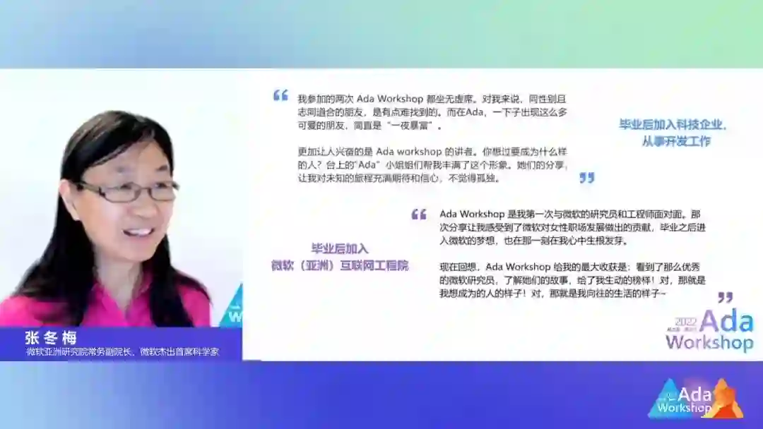 一位毕业后加入微软(亚洲)互联网工程院的女生说:“Ada Workshop 给了我生动的榜样!对,那就是我想成为的样子!”