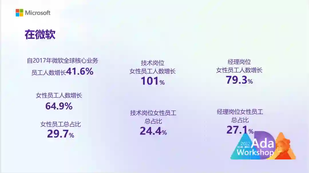 秉持着“予力全球每一人、每一组织,成就不凡”的使命,微软以多样的形式予力不同人生阶段的女性。我们关注高校女学生的成长,也为职场女性搭建更为多元与包容的环境,这些都在Ada Workshop 2022一一呈现。