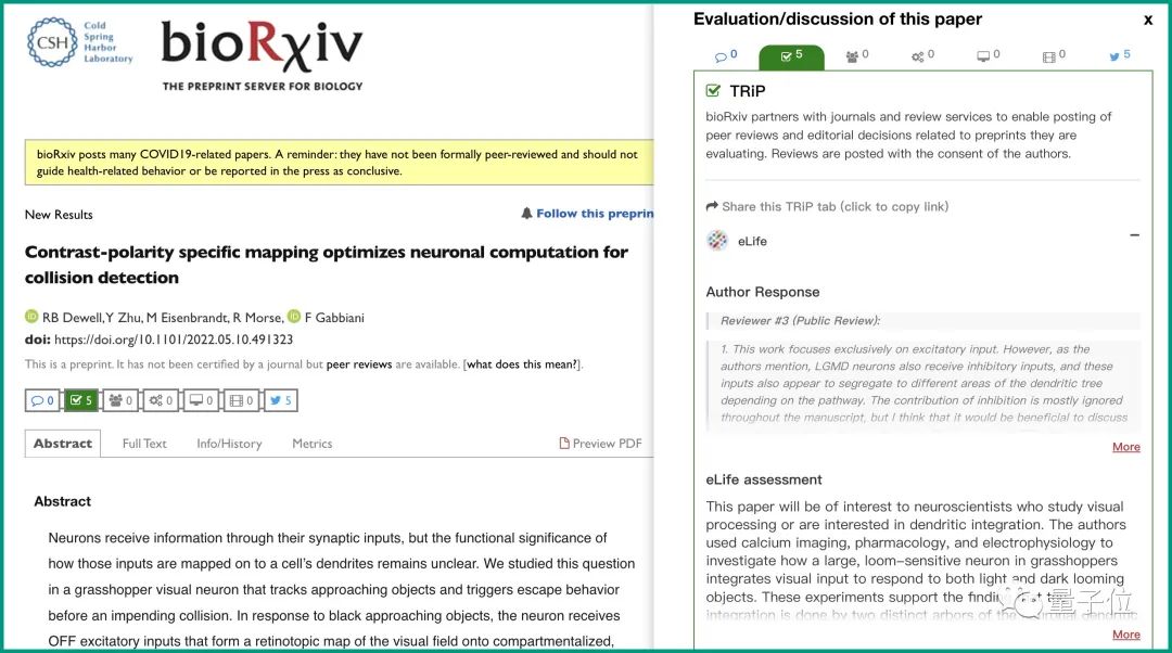 以bioRxiv为例,我们点开eLife选定的一篇研究,就能发现在网页的右侧,会弹出来针对这篇论文的评估和讨论。