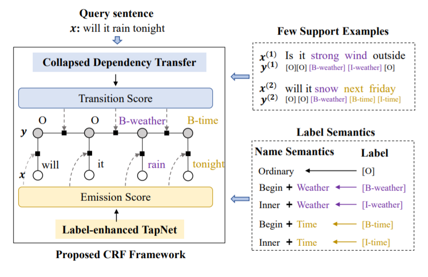 Collapsed Dependency Transfer和L-TapNet是ACL 2020 长文Few-shot Slot Tagging [1] 中提出的方法。具体的,为了建模标签之间的依赖关系(Transition Score),该工作提出了一种跨领域建模标签依赖关系的方法——坍缩依赖迁移(Collapsed Dependency Transfer, CDT)。CDT首先从数据充足的源域(Source Domain)学习抽象标签依赖关系,并在小样本的目标域中泛化学到的依赖关系来辅助标签序列的预测。