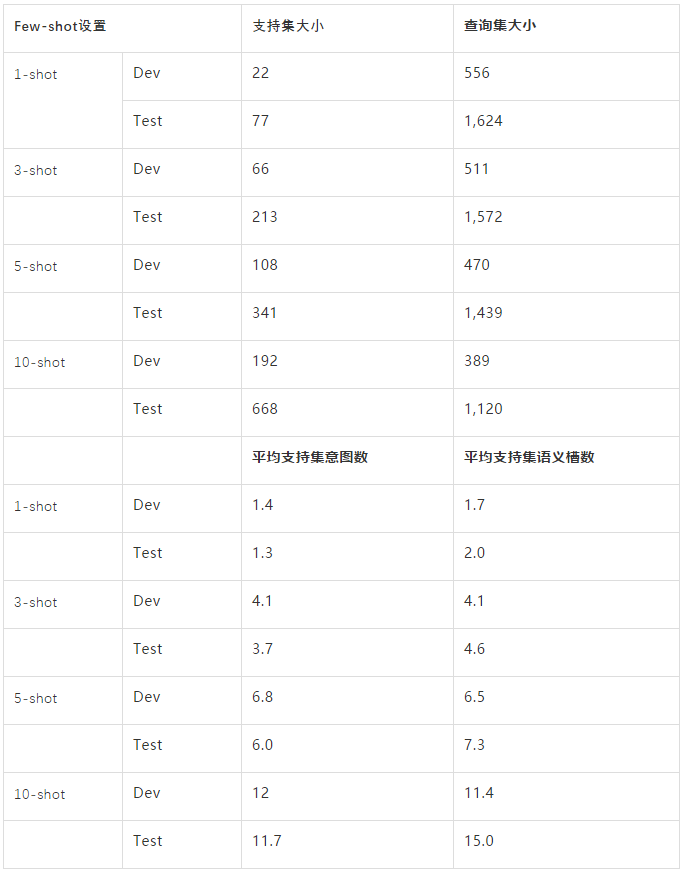 表2是我们重构后的小样本评测集信息,我们提供4种shot 设置:1,3,5,10。其中,3-shot是我们所推荐的主设置。