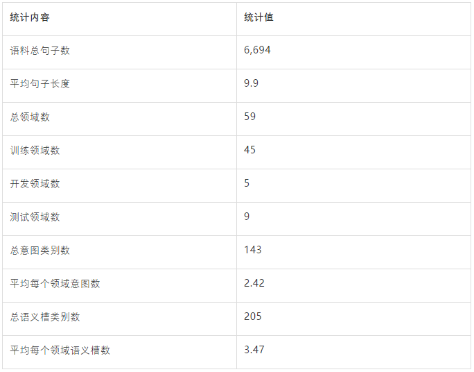 在对每一条数据进行用户意图和语义槽标注后,我们将所有59个domain分成3个部分:45个训练domain,5个开发domain,9个测试domain。我们将测试和开发domain数据重构为小样本学习形式:每个domain 包含一个人工构造的K-shot 支持集(support set),以及一个由剩余其他数据组成的查询集(query set)。
