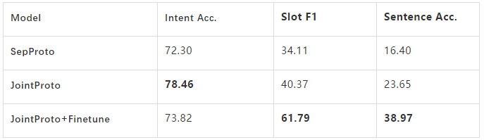 实验结果如表3所示,可以看到JointProto明显地优于SepProto,这体现出了联合学习Intent和slot的必要性。同时Finetune的结果提升也显示出了通过精调来适应目标领域的重要性。
