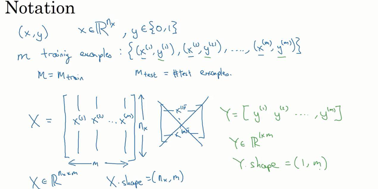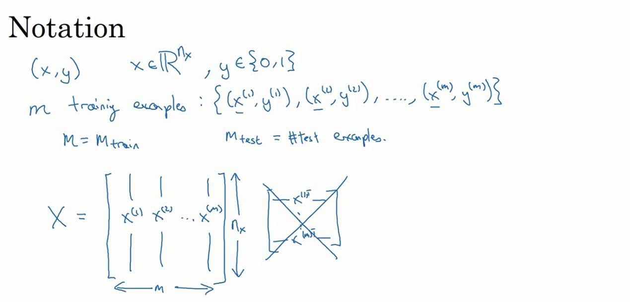 当你在后面的课程中实现神经网络的时候,你会发现,一个好的符号约定能够将不同训练样本的数据很好地组织起来。而我所说的数据不仅包括 x 或者 y 还包括之后你会看到的其他的量。将不同的训练样本的数据提取出来,然后就像刚刚我们对 x 和 y 所做的那样,将他们堆叠在矩阵的列中,形成我们之后会在逻辑回归和神经网络上要用到的符号表示。如果有时候你忘了这些符号的意思,比如什么是 m,或者什么是 n,或者忘了其他一些东西,我们也会在课程的网站上放上符号说明,然后你可以快速地查阅每个具体的符号代表什么意思,好了,我们接着到下一个视频,在下个视频中,我们将以逻辑回归作为开始。