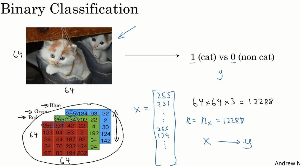 为了把这些像素值放到一个特征向量中,我们需要把这些像素值提取出来,然后放入一个特征向量 x。为了把这些像素值转换为特征向量,我们需要像下面这样定义一个特征向量 x 来表示这张图片,我们把所有的像素都取出来 例如 255、231 等等,直到取完所有的红色像素,接着最后是 255、134、…、255、134 等等,直到得到一个特征向量,把图片中所有的红、绿、蓝像素值都列出来。如果图片的大小为 64x64 像素,那么向量 x 的总维度,将是64 乘以 64 乘以 3,这是三个像素矩阵中像素的总量。在这个例子中结果为 12,288。现在我们用 n x =12288,来表示输入特征向量 x 的维度,有时候为了简洁,我会直接用小写的 n 来表示输入特征向量的维度。所以在二分类问题中,我们的目标就是习得一个分类器,它以图片的特征向量 x 作为输入,然后预测输出结果 y 为 1 还是 0,也就是预测图片中是否有猫: