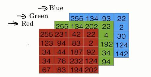 我们来看看一张图片在计算机中是如何表示的,为了保存一张图片,需要保存三个矩阵,它们分别对应图片中的红、绿、蓝三种颜色通道,如果你的图片大小为 64x64 像素,那么你就有三个规模为 64x64 的矩阵,分别对应图片中红、绿、蓝三种像素的强度值。为了便于表示,这里我画了三个很小的矩阵,注意它们的规模为 5x4 而不是 64x64,如下图所示: