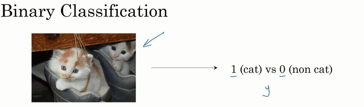 逻辑回归是一个用于二分类(binary classification)的算法。首先我们从一个问题开始说起,这里有一个二分类问题的例子,假如你有一张图片作为输入,比如这只猫,如果识别这张图片为猫,则输出标签 1 作为结果;如果识别出不是猫,那么输出标签 0 作为结果。现在我们可以用字母 y 来表示输出的结果标签,如下图所示: